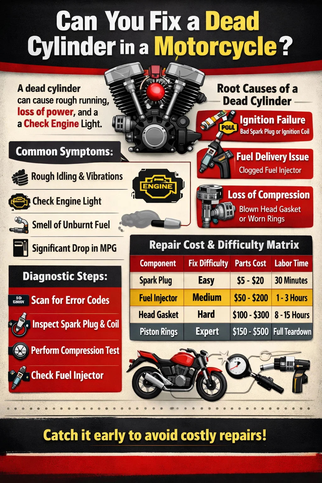 Hvis tennpluggen er tilsmusset eller tenningsspolen har sviktet, er blandingen den spesifikke motorsykkel sylinder vil ikke antennes. Bytte av tennplugg er den vanligste løsningen. Hvis spolen er død, er å bytte den med en spole fra en fungerende sylinder en fin måte å teste om "døden" flytter til det nye stedet.