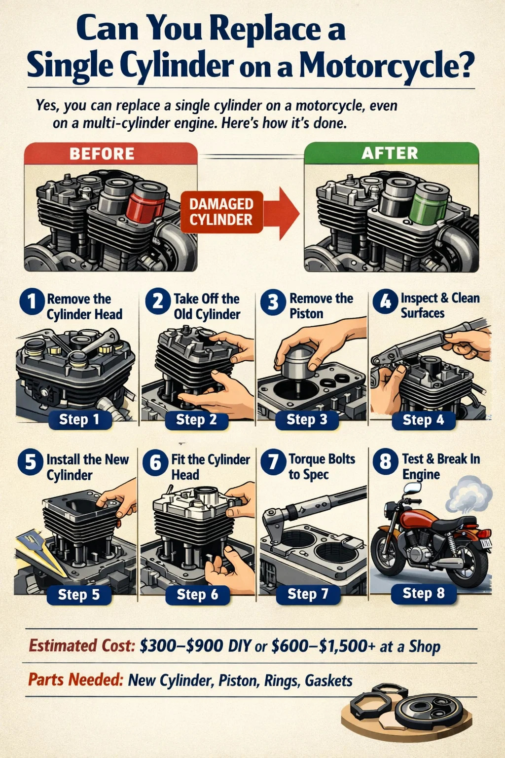 Kostnadene varierer mye basert på sylindertype, motorsykkelmerke og modell, om OEM eller ettermarkedsdeler brukes, og om arbeidet gjøres DIY eller av en butikk. Tabellen nedenfor gir realistiske kostnadsområder for de vanligste scenariene: