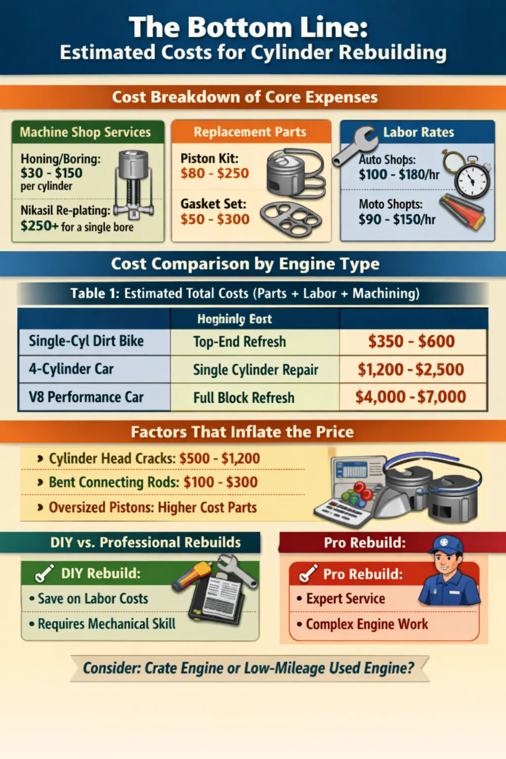 Kostnaden for å bygge om en sylinder varierer vanligvis fra $500 til $1500 per sylinder for bilmotorer, mens en enkelt motorsykkel sylinder kan ofte friskes opp mellom $300 og $800 . Disse tallene varierer veldig basert på om du gjør en "top-end" oppdatering (ringer og pakninger) eller en fullstendig mekanisk restaurering som involverer boring, honing og overdimensjonerte stempler. Hvis du utfører rivingen selv, kan du spare betydelig på arbeidskraft, noe som vanligvis står for 60 % til 70 % av den totale fakturaen.