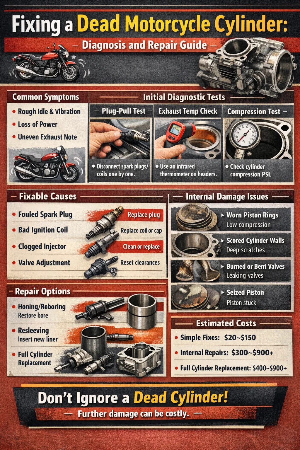 En motorsykkelsylinder som har gått død på grunn av en tilsmusset tennplugg, en tett drivstoffinjektor, en mislykket tennspole eller et mindre ventiljusteringsproblem kan bringes til live igjen med relativt enkle og rimelige reparasjoner. På den andre enden av spekteret, vil en sylinder som har fått en rillet boring, en sprukket løp, et fast stempel eller alvorlig ringslitasje kreve mer involvert mekanisk arbeid - inkludert potensiell sylinderbytte eller gjenboring. Poenget er at «død sylinder» ikke er en enkelt diagnose. Det er et symptom som sporer tilbake til mange forskjellige grunnårsaker, som hver har sin egen reparasjonsvei og kostnad.