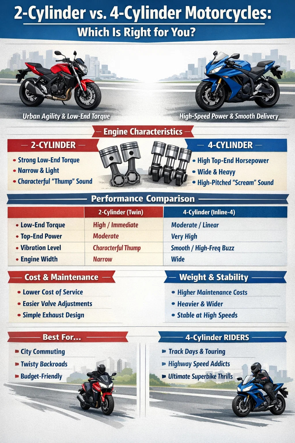 Spørsmålet om en 2-sylindret eller 4-sylindret motorsykkel er "bedre" har ikke noe universelt svar, men det funksjonelle skillet er klart: En 2-sylindret motorsykkel er overlegen for lavt dreiemoment, urban smidighet og smal ergonomi, mens en 4-sylindret motorsykkel er den ubestridte kongen av høyhastighetsstabilitet, topphestekrefter og jevn kraftlevering. Hvis kjøringen din består av bypendling og trange fjellsvingninger, gir to sylindre ofte en mer engasjerende opplevelse. Men hvis du har lyst på skriket fra en motor med høyt turtall og bruker tiden din på belter eller lange motorveier, er fire sylindre verdt den ekstra vekten og kostnaden.