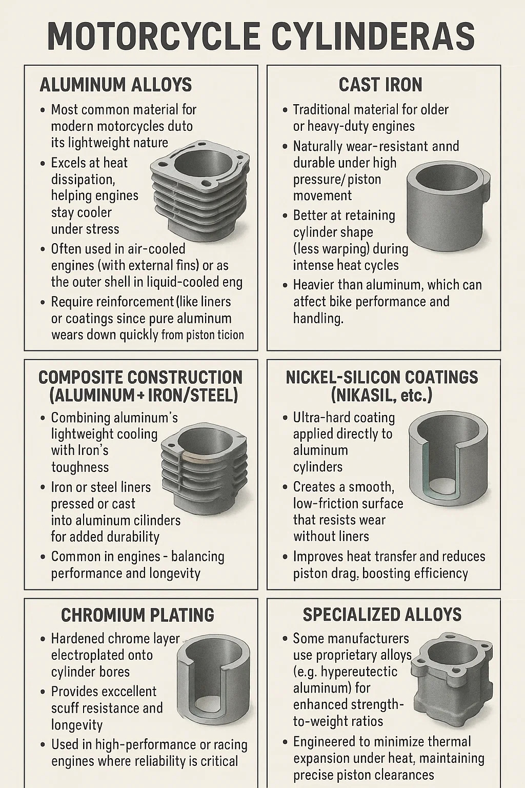 Motorsykkel sylindere er primært laget av metaller valgt for styrke, varmetoleranse og holdbarhet. Her er en detaljert oversikt over vanlige materialer og deres egenskaper: